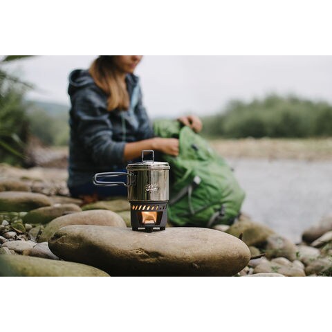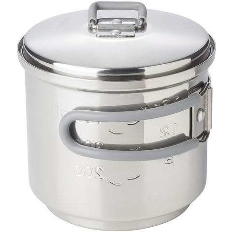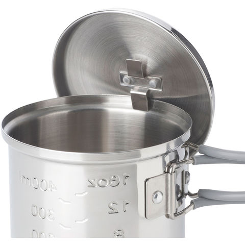 収納サイズが小さいクックセットを検討しているならば、このクックセットが理想的です.高品質なステンレススチール製のポットは約585ml.ポットにはml/oz単位で目盛り付きです.五徳は軽量なアルミニウム製で、ポットに収納できるようになっています.ハンドルは折りたたみ式で蓋にはポットの縁に引っ掛けておけるフック付きです.メッシュバッグが付属しています.