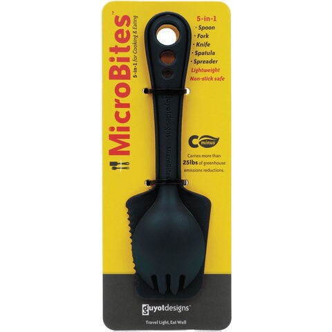 調理/食事のための5イン1.スプーン、フォーク、ナイフ、スパチュラ、スプレッダーの5種類の機能を2本に集約.ギヨデザインズ社のマイクロバイツは22gと軽量でノンスティック調理器具にも使用できます.湯煎して拭き取るだけで簡単にお手入れができます.2本を簡単に固定でき吊り下げ穴付きなのでカラビナなどに取り付けられます.