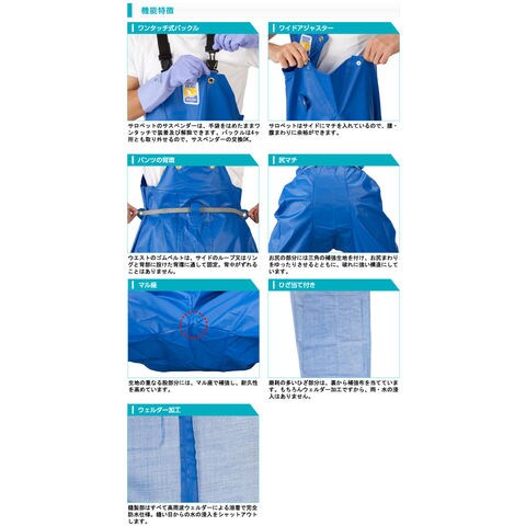 仕様:高周波ウェルダーによる溶着で防水加工、表地に高品質塩化ビニールと特殊フィルムを配合し、耐油性と抜群の耐寒性を実現、遠洋・中近海作業、湾岸作業、養殖業、水産加工業、サスペンダーのみの販売もあり、袋入り