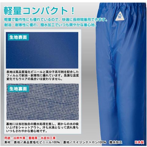 ロゴス LOGOS レインアタッカー ズボン ブルー M レインパンツ パンツ ズボン レイン ウェア 防水 撥水 耐寒 耐油 水産業 沿岸作業 養殖業 水産加工業 12560003