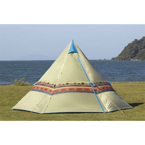 ナバホ柄のTepeeテント.ワンポールのシンプル構造だから組立てが簡単.フレームには、航空機にも使用される軽量で強靱な7075超々ジュラルミンを採用.コンパクト収納が可能で持ち運びも楽なため、フェスでも定番に.多彩なベンチレーション.フライシートに開閉可能な換気窓を装備し、湿気と湿度の調整で室内環境を快適にコントロールします.ポールにランタンフックを装備しています.インナードアにはLOGOSが独自に開発した高機能メッシュ[デビルブロックST]を採用.UV-CUT率、遮光率が通常比の約1.5倍です.きめ細かなメッシュなので小さな虫の侵入も防ぎます.肩かけ可能な取っ手付きの収納バッグ付属.