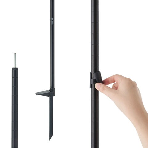 機能:3脚が邪魔にならない1本足構造、フックだけでなくラックの装備で小物置きになる、足元のステークを打ち込むだけの簡単設置、設置面によっては足で踏み込むだけで設置できる、センターピン付だからテントポールとしても使える、