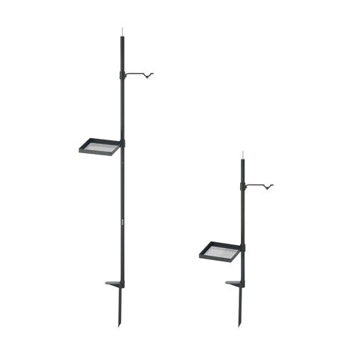 足元のステークを打ち込むだけの簡単設置!楽しみ広がる便利な多機能ランタンポール.スペースをとらず、狭い場所や置きたいところに自由に設置することができます.また、一本足構造のため足が引っかかりにくく邪魔になりません.フックが付いているのでランタンを吊るせ、また、パワーストックランタン(別売)を専用ネジに取り付けることも可能です.小物置きになるラック付き.ランタンフックとラックは取り付け構造なので自由な位置にセットでき、例えばフックに取り付けたパワーストックランタンと組み合わせることでスマートフォンなどの充電が楽にできます.分解できるので持ち運び、収納にも便利です.持ち運びに便利な収納袋付き.