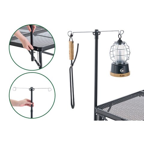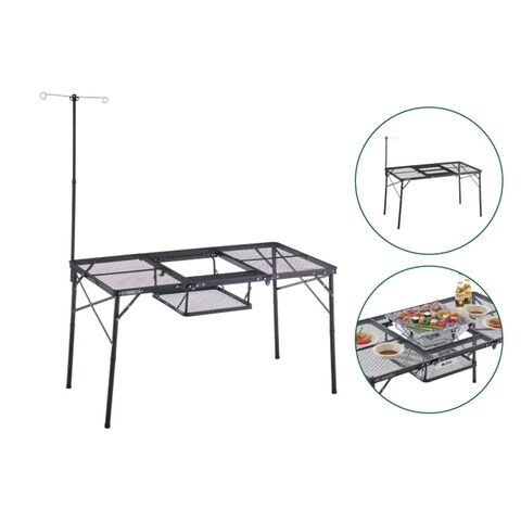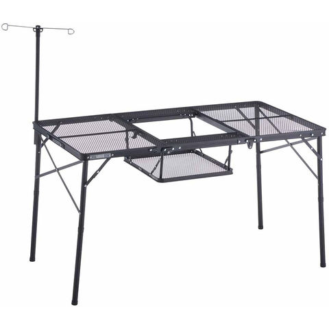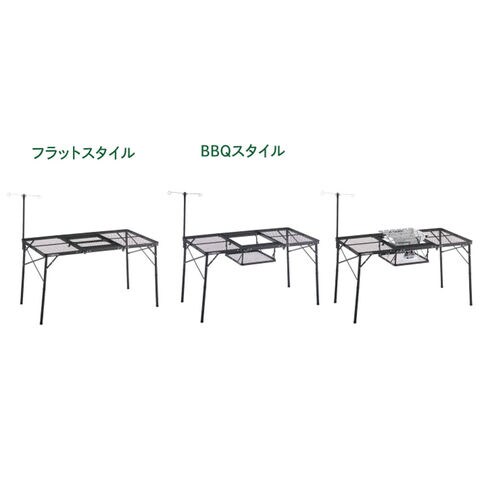 チェアに座りながらBBQが楽しめる!BBQグリルや、たき火台を設置できるテーブル.放熱性に優れた丈夫なスチールメッシュ天板を採用し、熱したダッチオーブンをそのまま置くことが出来ます.また、別売りの[ピラミッドTAKIBI]のM/Lサイズや[グリルアタッシュM]に対応可能.中央のセンターテーブルは単独でサイドテーブルとしてもお使いいただけます.着脱式のランタンポール付属で、BBQの際に手元をランタンで明るく照らす事ができたり、調理ツールの置き場としても活躍します.メインテーブルは2段階で高さ調節が可能です.ローポジションでは、囲炉裏スタイルでたき火を楽しむことができます.