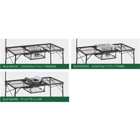 特長:チェアに座りながら焚き火やBBQが楽しめるBBQテーブル、別売りの LOGOS the ピラミッドシリーズ M/L サイズ対応可能、高さ2段階、放熱性に優れたスチールメッシュ天板、コンパクト収納(三つ折り収納)、ランタンポール付き、大人数で囲める大型テーブル、収納に便利なベルト付き