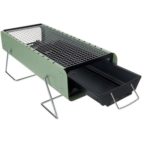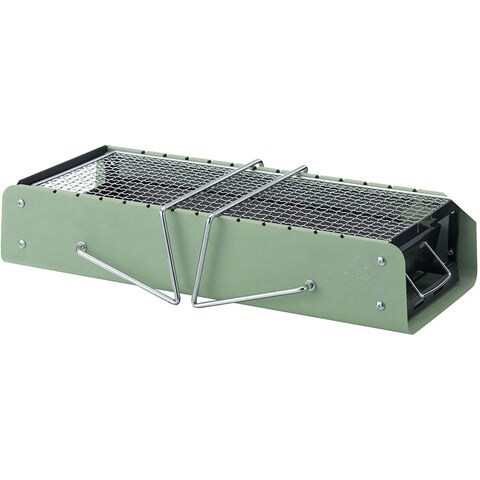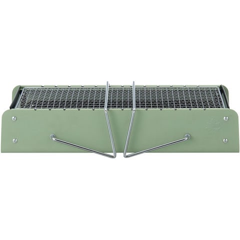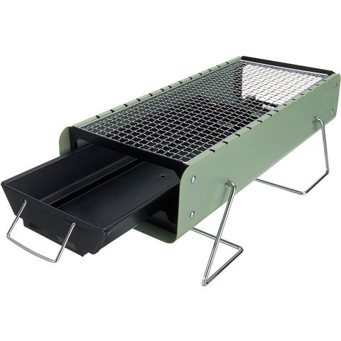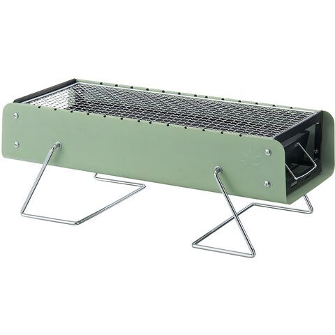 卓上で使えるグリルの特徴は、横長デザインとカラーリング.卓上でもテーブル面を有効に使える.テーブルの上で炉端風にわいわいBBQを楽しむことができる.火床は左右にスライドするので、燃料の継ぎ足しも簡単.お手軽に設置できる卓上BBQグリル.本体に付属のスタンド脚をくるっと回して開閉するだけの、簡単設置.高さのあるスタンド脚が、テーブル面を熱から守ります.別売りの[エコココロゴス・ラウンドストーブ]がぴったり収まるサイズ.ライターで簡単に着火するので、めんどうな火おこしがなく、すぐにBBQをスタートできます.