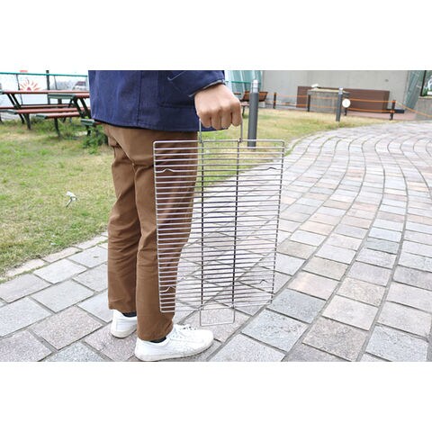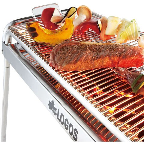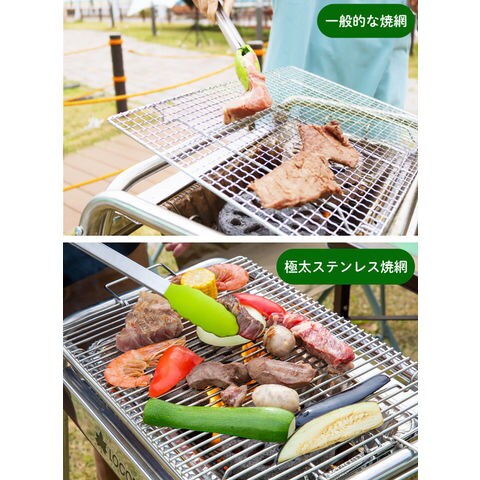 丈夫で繰り返し使える!極太タイプのステンレス製焼網.3.5mmの極太ワイヤーを使った、ステンレス製の焼網.ストレートタイプだから、焦げ付きも落としやすくお手入れ楽らく.耐久性が高くサビにくいステンレス素材を採用.繰り返し使えるため、経済的で業務用としての取り扱いにも最適.左右には持ち手付きで、持ち運びに便利.ロゴスの対応グリルだけでなく、市販のグリル本体に乗せて使用することも可能です(※グリルサイズと網サイズを確認してお求めください.).一般的な焼網と比べて重量があるため、焼網に食材がくっついてしまってもズレたり持ち上がることがありません.小さめのケトルや鍋であれば、上に乗せてゴトク代わりに使えます.
