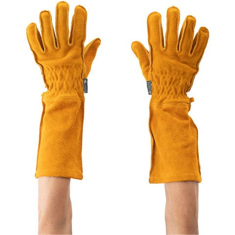 BBQやたき火のためのロングタイプの耐熱グローブ.耐熱性に優れた牛革を使用した丈夫な作りのレザーグローブ.上腕まで保護するロングタイプで、手のひらや指部分に革を重ね貼りすることで断熱性を高めている.一般男性向けのMサイズ.中指の長さの5倍が適当なサイズの目安です.