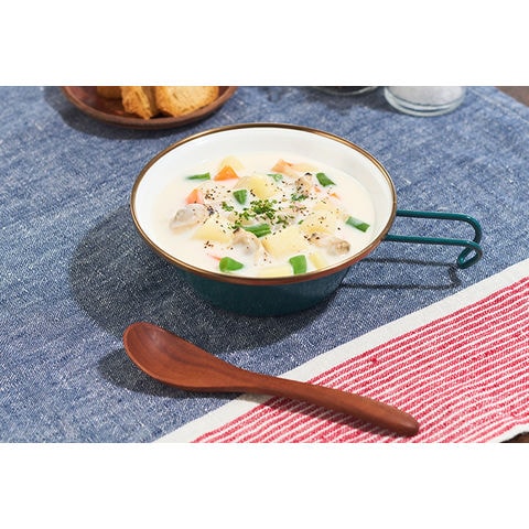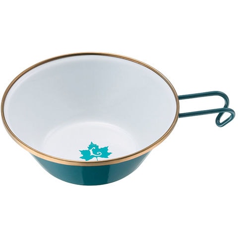 熱やにおいに強く、長く使える!調理や取り皿に使えるホーロー製シェラカップ.耐熱性・耐久性に優れ、においもつきにくいホーロー製のシェラカップ.スープや取り皿としても使いやすい容量310mlサイズ.直火やオーブンでの調理や温め直しができ、自宅でもアウトドアでも活躍します.取っ手は指をかけやすい形状です.ホーローの特長として、保温性・保冷性に優れているため、冬はあたたかい料理が冷めにくく、夏は冷たい料理がぬるくなりにくい.お手持ちのザックにカラビナなどで吊り下げることができます.経年劣化を楽しみながら長く愛用いただけます.ブラスカラーの口巻きが雰囲気のあるクラシカルなデザインです.