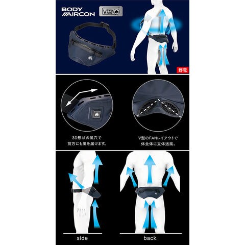 いつでもどこでも涼しく快適なベルト式エアコンがさらに進化!人気の[野電 ボディエアコン]シリーズ.Vツイン気流を生む立体構造の2つのファンが、背中、脇、お腹への広範囲送風を実現したベルト式エアコン.別売りの[氷点下パック コンパクト]併用で、より冷却効果を高めることができます.ファンの吸気口を下向きに配置することで、防水生地&止水ジッパーなど雨にも強い構造に.風量は暑さに応じてお好みで3段階調節ができます.どんな服装にも、さまざまなシーンで活躍するデザインです.衣服を被せるとスマートに隠れるので、ほ
