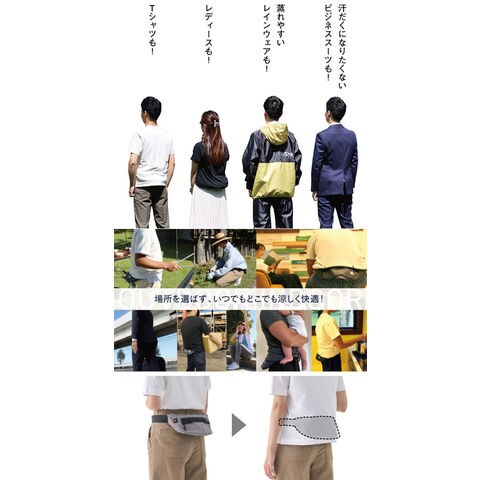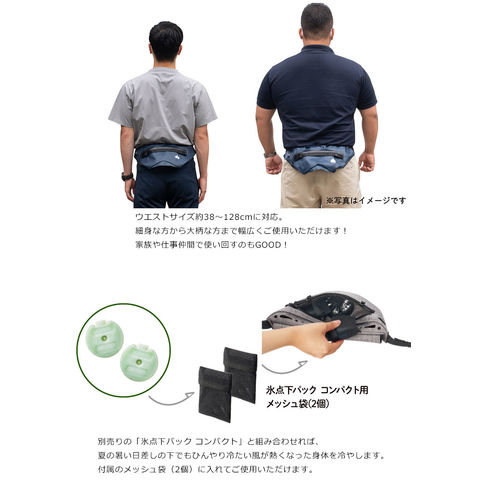 特徴:作動時間最大46時間、熱中対策品、普段使いもできるデザイン、いろんな服装に合うので気軽に使える、腰に巻いて服を被せるだけの簡単装着、ハイパワーのコンパクトファン、氷点下パック・コンパクトとの併用で冷気の送風が可能