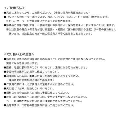 機能:-16℃の超強力保冷剤!/保冷能力8倍(一般保冷剤に比べ)/一般保冷剤と併用すれば一般保冷剤がより長持ちします/冷凍庫に常備で急な停電も安心!いざという時にも庫内の冷たさを保ってくれます/植物性天然高分子の使用で安心/使いやすい半透明容器!凍結状態が一目瞭然