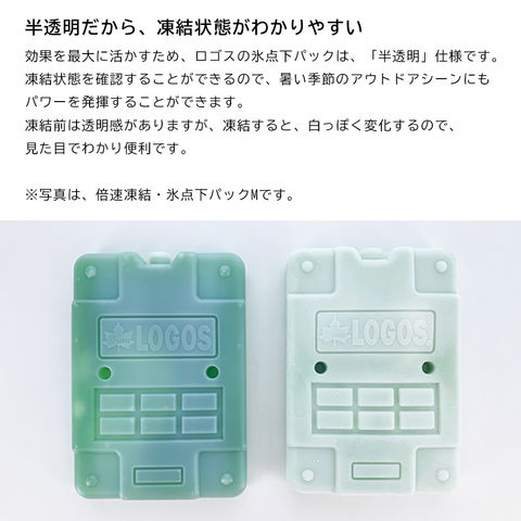 一般的な保冷剤の約8倍もの冷却能力を誇る、圧倒的な冷却力.しかも、事前の凍結時間は約18~24時間と、従来品の約半分になった[氷点下パックシリーズ]のスピード凍結タイプです.食べ物や飲み物はもちろん、冷凍食品やアイスクリームまでしっかり冷やせます.さらに、冷凍庫に常備しておけば、停電時などの緊急時にも庫内の冷たさをキープしてくれます.内容物には植物性天然素材を使用しているため、安心してご使用いただけます.効果を最大に活かすため、ロゴスの氷点下パックは、容器が[半透明]仕様です.凍結状態を確認することができるので、暑い季節のアウトドアシーンにもパワーを発揮することができます.