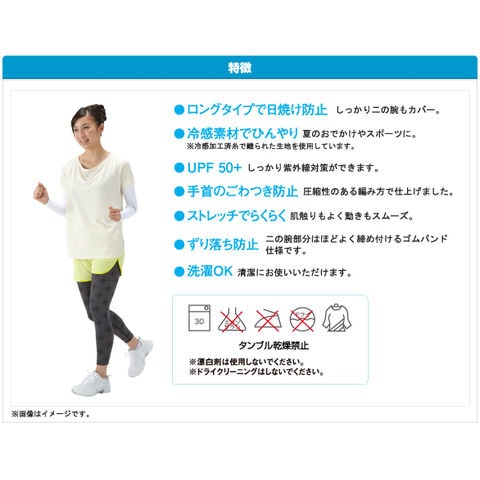 ●特長:スーパーストレッチで腕がスッキリ美しいフィットタイプ/冷感加工生地使用で、ひんやり感持続!/UVカットUPF50+/ずり落ち防止ゴム仕様/洗濯OK