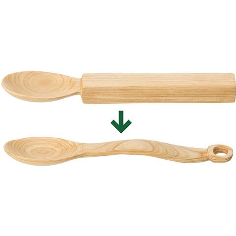 はじめてのクラフト体験に!ナイフで削って作る木製スプーン.ナイフで削るだけで世界にひとつだけのスプーンが作れるキット.素材は、削りやすく程よい強度を併せ持つ松の木を採用.丸みが必要になる部分など難しい加工は済ませてあるため、子供でも簡単に制作できます.クラフト体験をより安全に楽しむなら別売りの[ LOGOS カットプロテクトグローブ]の着用がおすすめ.木製のスプーンは口当たりがよく、熱が伝わりにくいためスープなどの熱いものを飲む時にも便利です. ( ※ナイフとサンドペーパー、仕上げ用オイルは付属していません. )