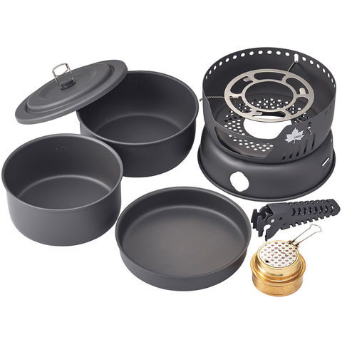構成: クッカー(大鍋、小鍋、フライパン)、コンロ、グリッパー、アルコールバーナー、収納袋