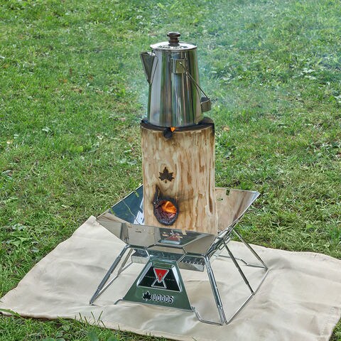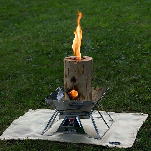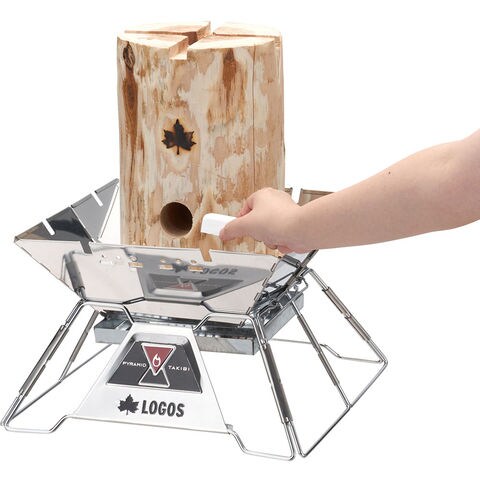 特徴:風に強いロケットストーブ型、直火調理OK(切込み部分がゴトクになるため、たき火として暖をとるのはもちろん、調理器具を直接置いて調理が可能.丸太の上にスキレットや、ダッチオーブン等を置いて調理や湯沸かしができます.)、別売り[防水ファイアーライター]での着火がおすすめ、国産杉の間伐材を使用、