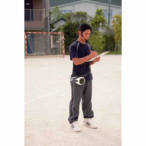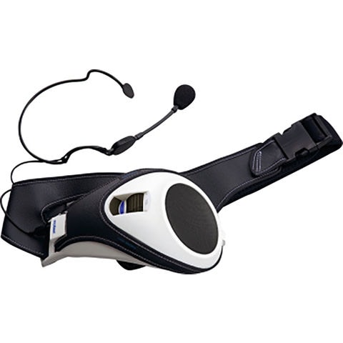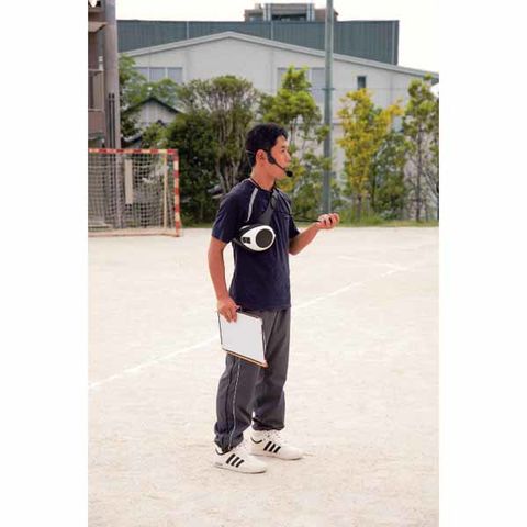 体を動かしながら体育の授業やレッスンなどで使用出来る、スポーツ指導者用[着る拡声器]です.身体へのフィット性が高く、スポーツを指導する体育教師、監督、コーチ、インストラクターといった身体を動かす方々に向いています.マイクスピーカーと別に、MP3プレーヤーなどの音源を鳴らしながらの効果的な実技指導が可能です.