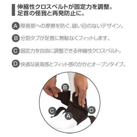 伸縮性クロスベルトが固定力を調整.足首の怪我と再発防止に.障害部への摩擦を防ぐ、縫い目のないデザイン.分割タブが足首に無駄なくフィットします.固定力を自由に調整できる伸縮性クロスベルト.快適な装着感とフィット感のかかとオープンタイプ.