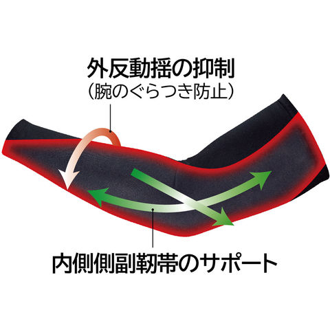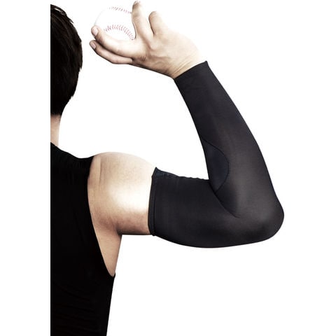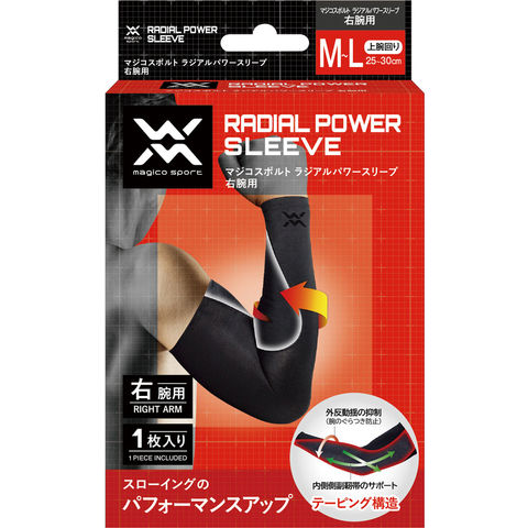 マジコスポルト・ラジアルパワースリーブは抜群の軽さとストレッチ性、フィット性を備え、腕全体の適圧サポート.投球時の捻転によるブレを制御し動きを安定化.内側側副靱帯を守るテーピング構造で腕・ひじにかかる負担の軽減・保護から、パフォーマンスアップまでをサポートします.