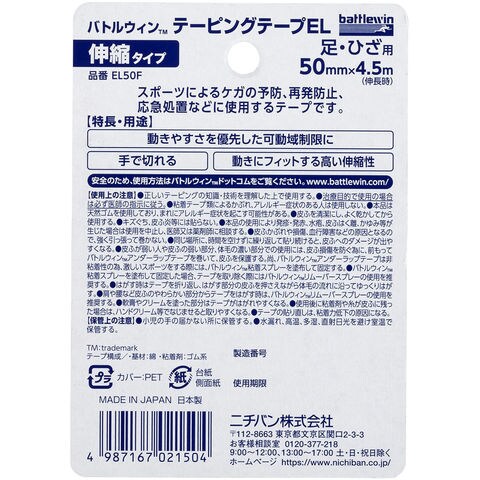 ニチバン NICHIBAN バトルウィン テーピングテープ 伸縮タイプ 足首・ひざ用 50mm×4.5m 伸長時 ブリスター 保護 手で切れる はくり紙なし トレーニング けが予防 EL50F