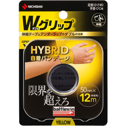 ニチバン NICHIBAN バトルウィン Wグリップ ハイブリッド 自着バンデージ 足首(小さめ)・手首・ひじ用 50mm×12m 黄色 イエロー 伸縮 ブリスター テーピング 固定 軽量 WGP50FYL