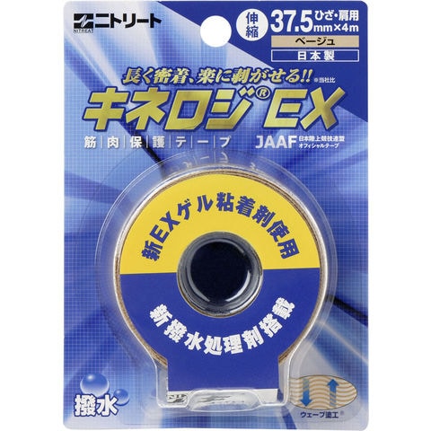 長く密着、なのに楽にはがせるキネシオロジーテープです.動きに追随する新EXゲル粘着剤を使用しています.汗や水に濡れても粘着性を維持できるため長時間の貼付や重ね貼りが可能です.肌に優しい粘着剤ですので、テープをはがす時の体毛抜去や角質剥離を抑えます.ウェーブ状に粘着剤が塗られており、通気性に優れています.
