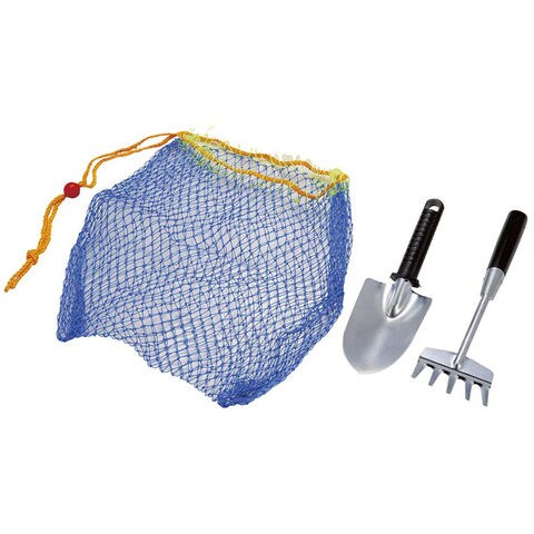 スコップ、クマデ、アミがセットになった潮干狩り 3 点セット.