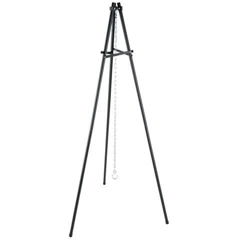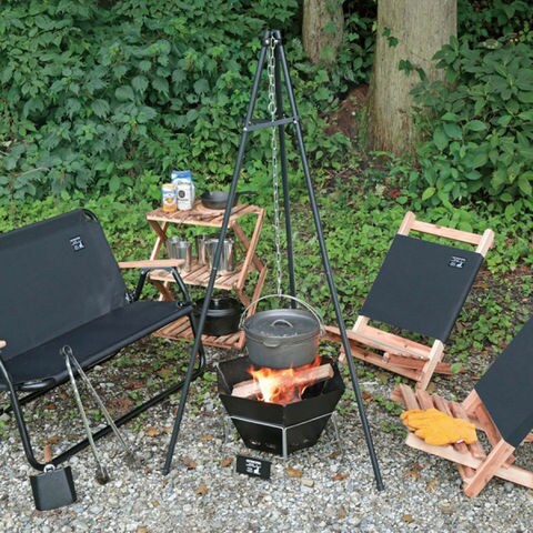 ダッチオーブンや大型鍋が吊るせる丈夫な三脚です.シンプル構造で組み立てが簡単です.コンパクトに収納できます.自在カギをかける位置で、チェーンの長さを調整できます.干しかごも吊るせます.(※干しかごを吊るす際は、焚き火など熱源となる燃焼器具は使用しないでください.)収納バッグ付.
