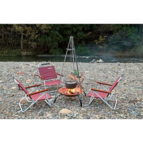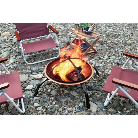 ヨーロッパスタイルのファイアピットが手軽に楽しめます.風合いのあるブロンズカラー、脚を広げるだけで簡単に組立できます.持ち運べるポータブルタイプ.焚火に便利です.火の粉の飛び散りをおさえるメッシュフード付き.アミ付きでグリルとしても使用できます.UG‐10トライン焚火三脚と組合わせて使用できます.