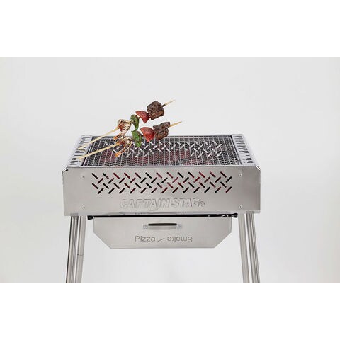 1台7役のステンレス製多機能グリル.焚火やBBQの熱でピザが焼けます.スライド式のトレーに24cmまでのピザが入ります.トップオーブンシステムによる上からの加熱で、生地が焦げずにふっくら焼き上がります.ハイ72cm・ロー34cmの高さ2段階調節が可能.本体はダッチオーブン25cmがすっぽり入る大きさ.焼き面の両サイドにある大小2種類の穴で串焼きも可能.串を差し込む穴を変えることで焼き加減を調節できます.