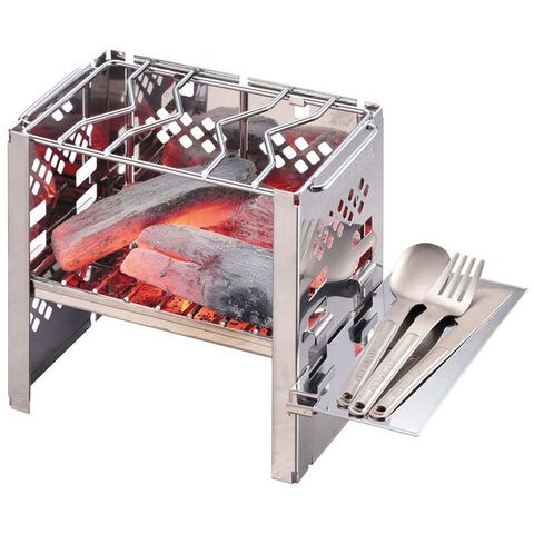 カマド スマートグリル B6型用のオプションパーツ.1台3役のマルチパネルです.薪などの燃料がこぼれにくくするフロントパネルとして.長い薪を使う時の補助トレーとして.カトラリーなど小物が乗せられるサイトドレーとして.※UG-34(旧タイプ)には、サイドトレーとして使用できません.