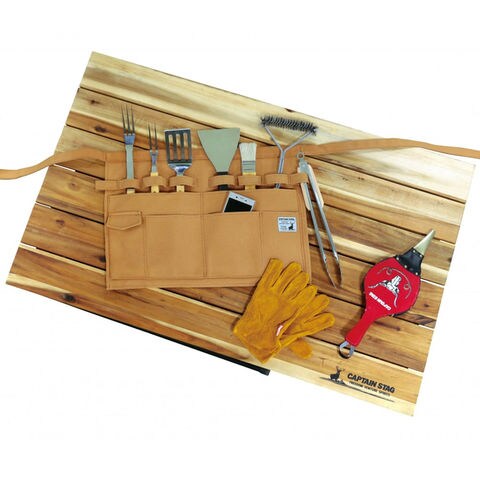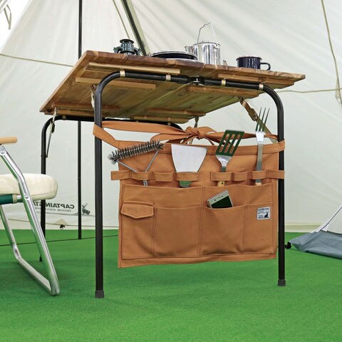 BBQだけではなく、テント経営などのフィールドワークやDIYにも適した多機能エプロン.テーブルの金具等にも取り付け可能です.