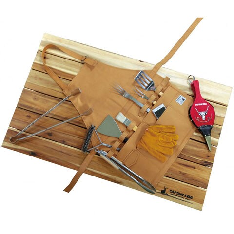 BBQだけではなく、テント経営などのフィールドワークやDIYにも適した多機能エプロン.テーブルの金具等にも取り付け可能です.