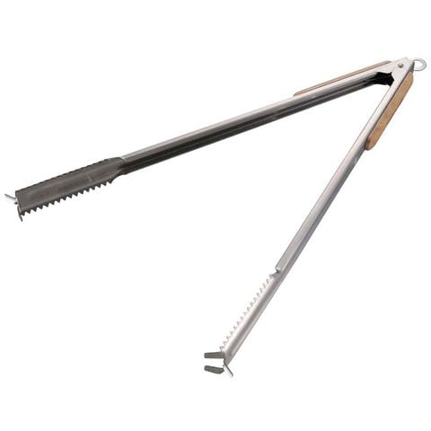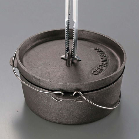 ダッチオーブンのリッドリフターとしての機能も兼ねる、1台2役の炭バサミです.炭バサミの先端に、ダッチオーブンの蓋などがつかめる[かぎ爪フック]が付いています.かぎ爪フックには、蓋を持ち上げたときの揺れや傾きを軽減する突起が付いています.握りやすい木製グリップ.収納に便利なストッパー付き.