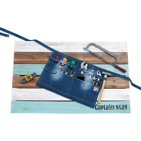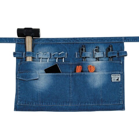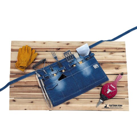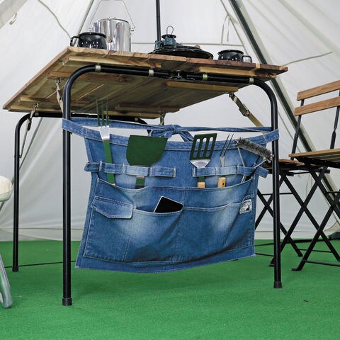 バーベキューや、テント設営などのフィールドワークやDIYにも適した多機能エプロンです.丈夫なデニム生地を使用.ワンウォッシュ加工で、しなやかな使い心地です.テーブルの金具等に取り付けて小物入れとしても使用できます.
