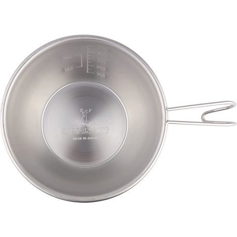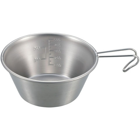 金物の町、燕三条で生産しています.フィールドでのアクティブシーンに応える、シンプル、ベーシック機能をコンセプトにしたシェラカップ.優れた耐久性のある18-8ステンレスを採用.小さな鍋としても使用できるビッグサイズ.計量に便利な目盛付.積み重ねができて、すっきり収納できます.