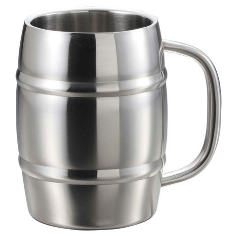 放熱しにくい中空二重構造.丈夫なステンレス鋼.樽型のメガジョッキでビールが楽しめます.