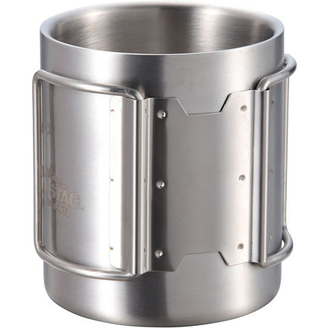 中空二重構造で冷めにくいステンレス製マグカップ.ハンドルは折りたたみ可能.
