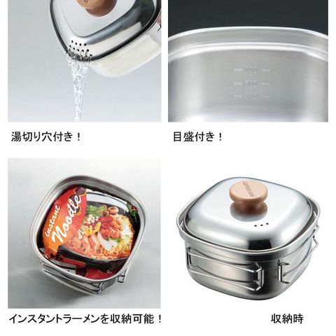 金物のまち、燕三条で生産しています.キャンプやトレッキングなど、1~2人用に適したクッカーです.ふたは湯切り穴付き.インスタントラーメン2個を鍋の中に入れて一緒に持ち運べます.