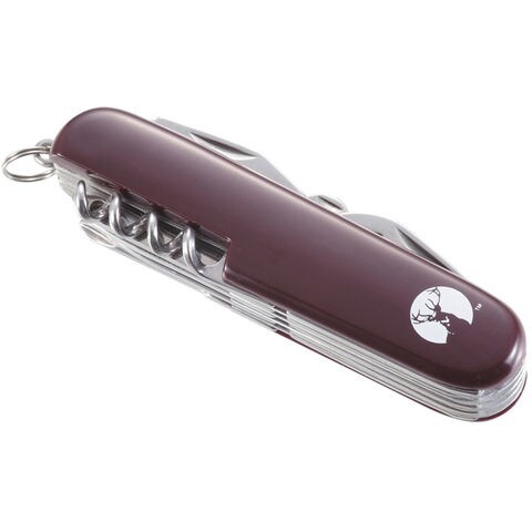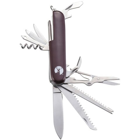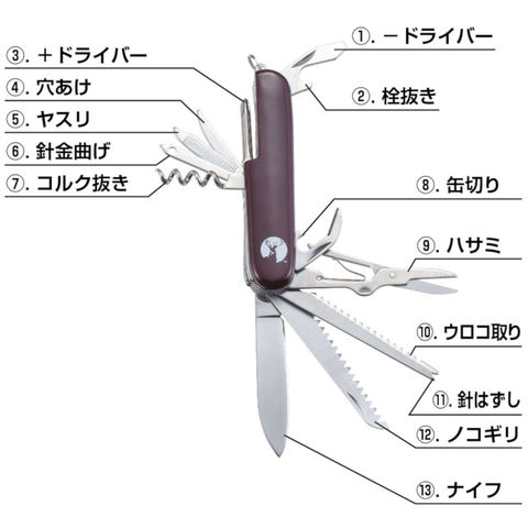 機能:1.ドライバー、2.栓抜き、3.+ドライバー、4.穴あけ、5.ヤスリ、6.針金曲げ、7.コルク抜き、8.缶切り、9.ハサミ、10.ウロコ取り、11.針はずし、12.ノコギリ、13.ナイフ