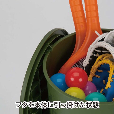 座れる、フタ付きバケツ.フタには引っ掛けられるフック4箇所付、アウトドアの収納、レジャーの収納に.