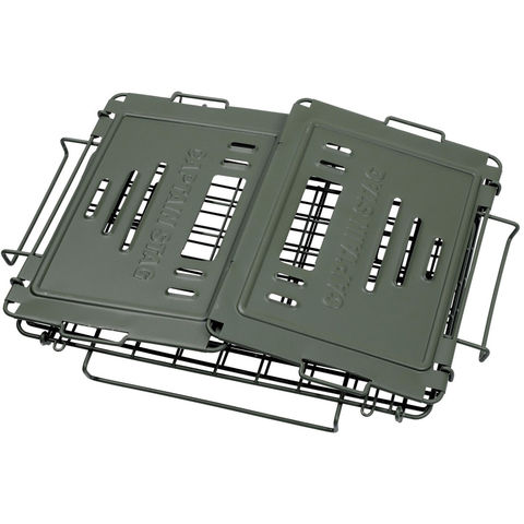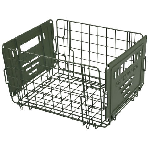 丈夫なスチール製バスケット.組立簡単で畳んで収納可能.アウトドアだけでなくお家でも使える.ワイヤーメッシュと鋼板を組合せたオシャレなデザイン.沢山の道具を綺麗に収納・整理・運搬ができる.積重ねも可能.