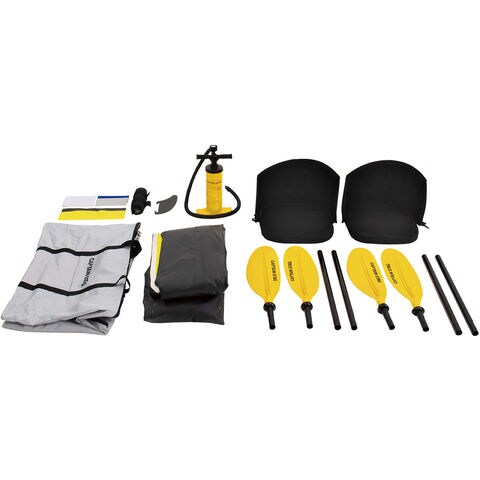 付属品:4分割パドル×2、背もたれシート×2、ハンドエアーポンプ(エアーゲージ付き)×1、着脱フィン×1、フットレスト×1、補修キット(共生地パッチ5種)、収納バッグ