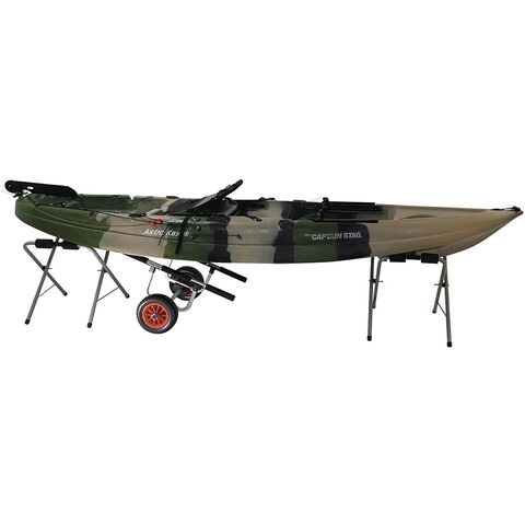 メンテナンス等に便利なカヤック用のスタンド.全長 が54cmで、ペダルドライブが付いている大型のフィッシングカヤックでも、地面に部品がつかない高さ.