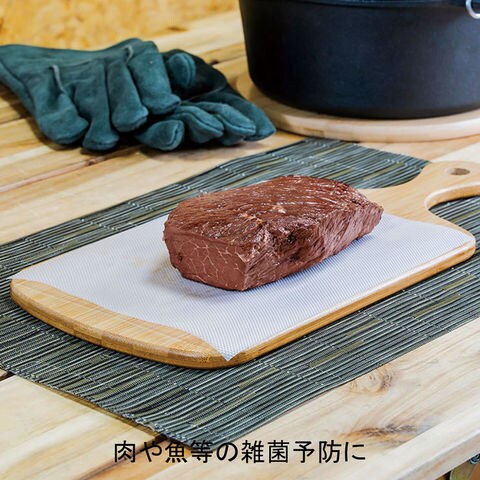 好きなサイズにカットして使えるシート.左右どちらからでも好きな長さにカットできるスライダー付.衛生的な使い捨てタイプで、肉や魚等の雑菌予防に.まな板への、人参の色移り、にんにくのにおい移りを防げます.シートごと持ち上げると、カットした野菜を鍋やボールへ入れるのに便利.
