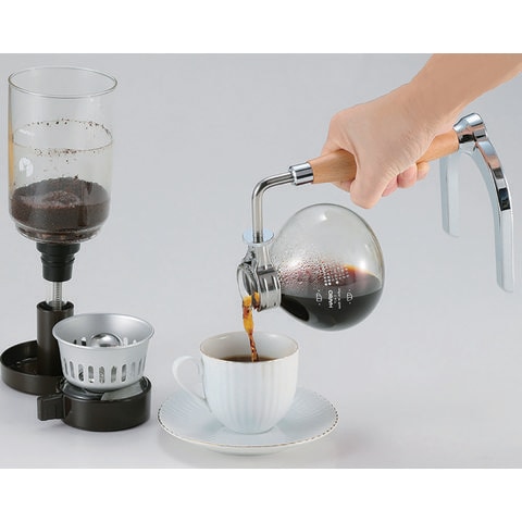 アウトドアで似合う、おしゃれな木柄仕様.サイフォンで淹れるコーヒーは、コーヒー粉に一定量のお湯を浸してじっくりと抽出する『浸漬(しんし)法』を使って淹れていきます.ロート内でコーヒー粉とお湯を混ぜてコーヒーを抽出していくので、ロート内で、飽和状態になると、それ以上溶け出しません.そのためサイフォン式コーヒーで淹れたものは、柔らかくすっきりとした味わいが特徴です.日本製.