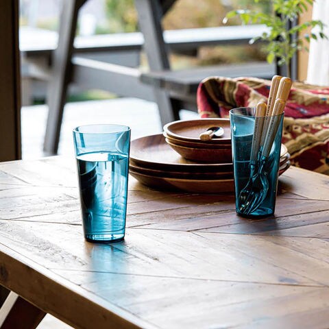 ”CS Forest Cafe”のテーブルウェアは、ガラスのように見えるのに落としても割れない特殊樹脂[トライタン]製.トライタンは耐熱性に優れており、熱湯もOK.食器洗浄機にも対応しています.●タンブラードリンクやカクテルが映える、シンプルで使いやすいタンブラー.高さがあるのでカトラリースタンドとしても使えます. スティック状の野菜やお菓子を入れてパーティーシーンにも. 口当たりのよさにこだわり、飲み口の薄さを約1mmに仕上げました.飲み物本来の味や香りを楽しめます. スタッキングもOKです.