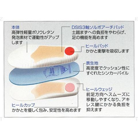 ランニング専用インソールの表生地として開発されたハイゲージシンカーパイルが足底マメを防ぎ、3つのアーチを支えて効率よく安定したフォームで長時間走ることができるDSISインソールです.疲れと足のトラブルからランナーを守るので、競技選手から健康志向の方までランナーの必需品としてご愛用いただけます.