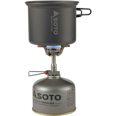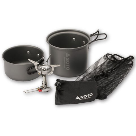 耐風性に優れたすり鉢状のバーナーヘッドや耐衝撃性を向上させたステルスイグナイターなどSOTOの技術をバランスよく詰め込んだエントリーモデルの[アミカス]に燃料ボンベ(250缶・110缶)がピッタリ収まるアルミ製クッカー(大・小)をセットしたモデルです.
